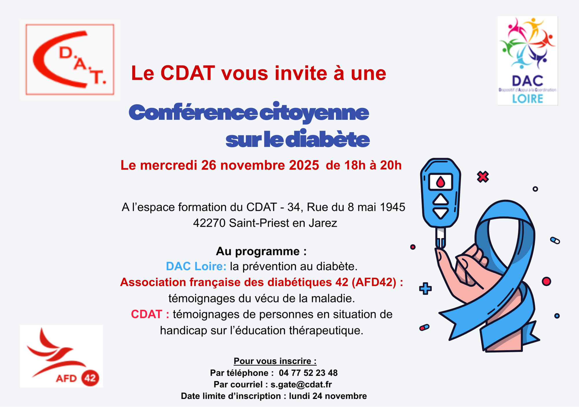 29/12/2025La journée de prévention sur le diabète Le CDAT a reçu le DAC Loire (Dispositif d'Appui à la Coordination des parcours de santé) lors de la journée de prévention sur le diabète le 26 novembre. La journée commence par un accueil chaleureux puis trois ateliers sur les thèmes de la nutrition, l'activité physique et le diabète. Ces ateliers se sont déroulés tout au long de la journée.